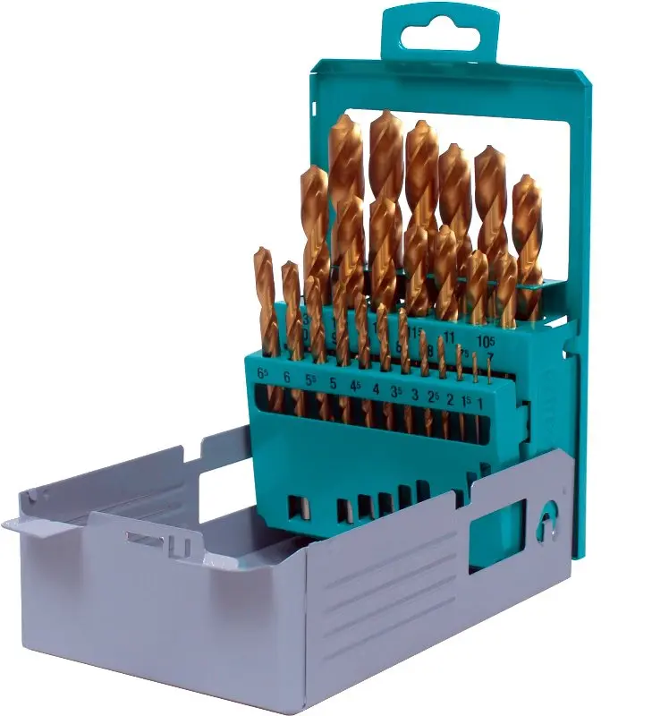 Sada obsahuje 25 vrtákov do kovu s priemerom 1 - 1,5 - 2 - 2,5 - 3 - 3,5 - 4 - 4,5 - 5 - 5,5 - 6 - 6,5 - 7 - 7,5 - 8 - 8,5 - 9 - 9,5 - 10 - 10,5 - 11 - 11,5 - 12 - 12,5 - 13 mm