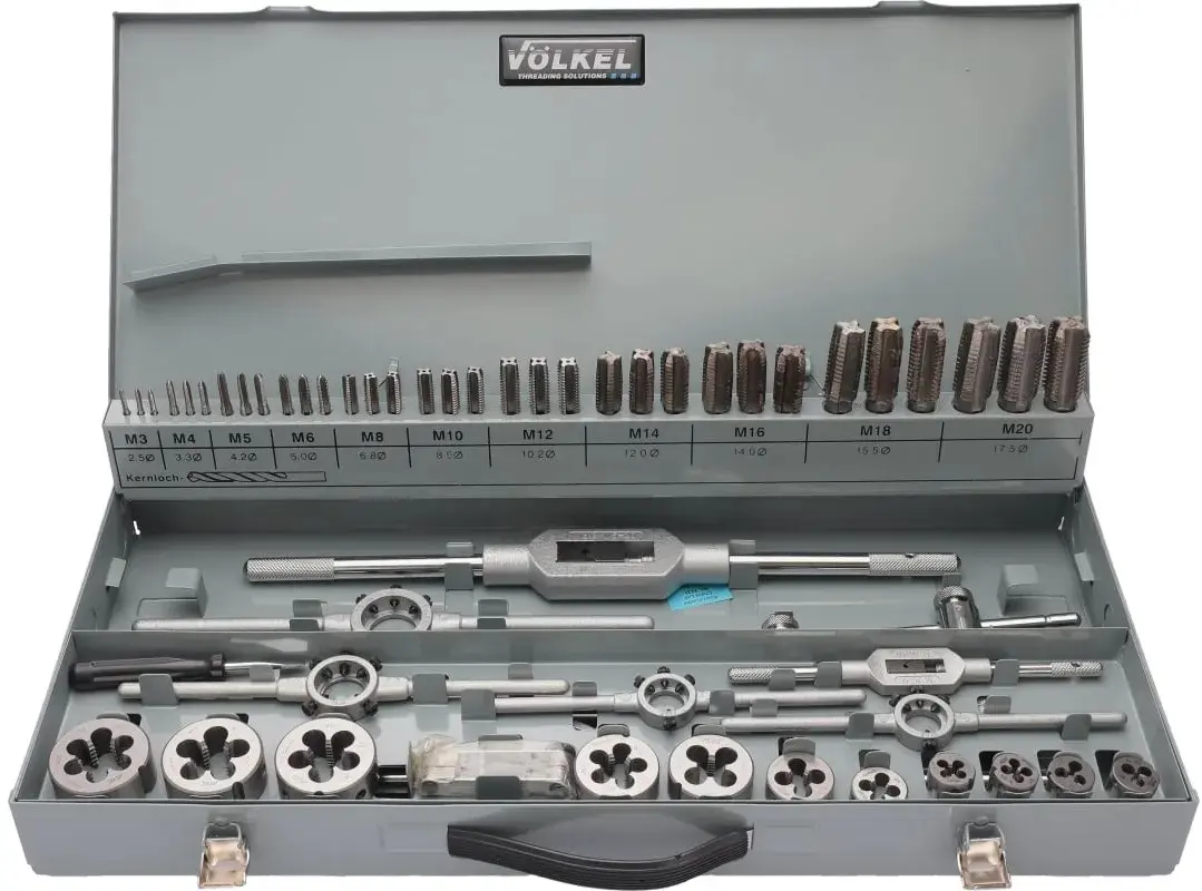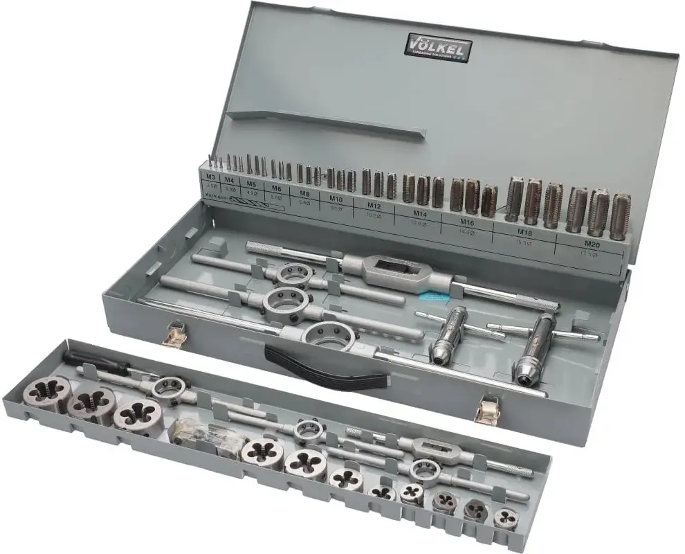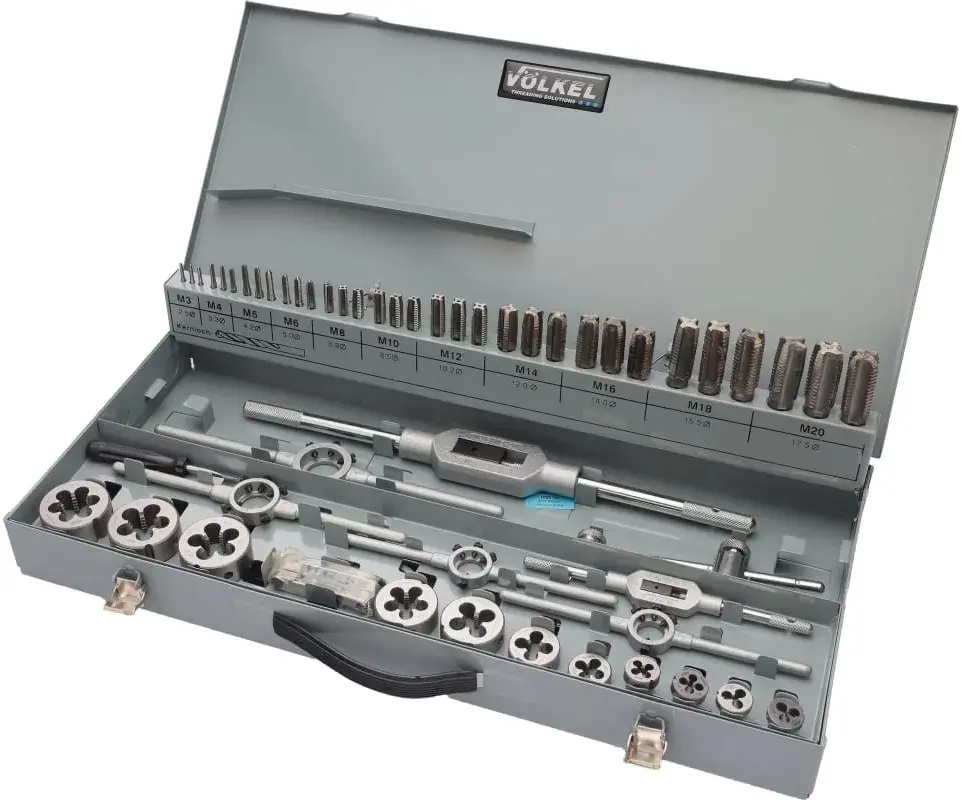 Závitníky a závitové očká HSS-G M3 ÷ M20 Volkel 49201 v kovovej kazete. Sada 45 dielov (DATVOL49201)