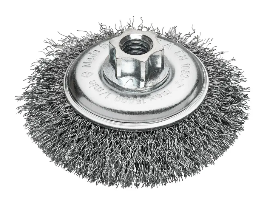 Vhodné pre uhlové brúsky 115 mm a 125 mm. Šikmé kefy s vlnitým drôtom sa používajú na stredne náročné kefovanie, napríklad opracovanie ťažko dostupných miest, odstraňovanie hrdze a leštenie, odstraňovanie náterov, nečistôt a okujú, na odihlovanie.