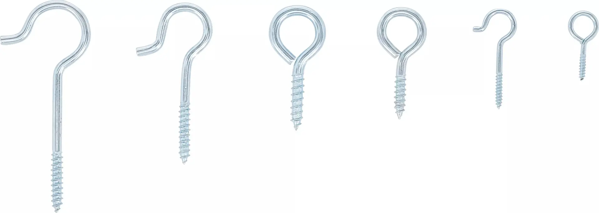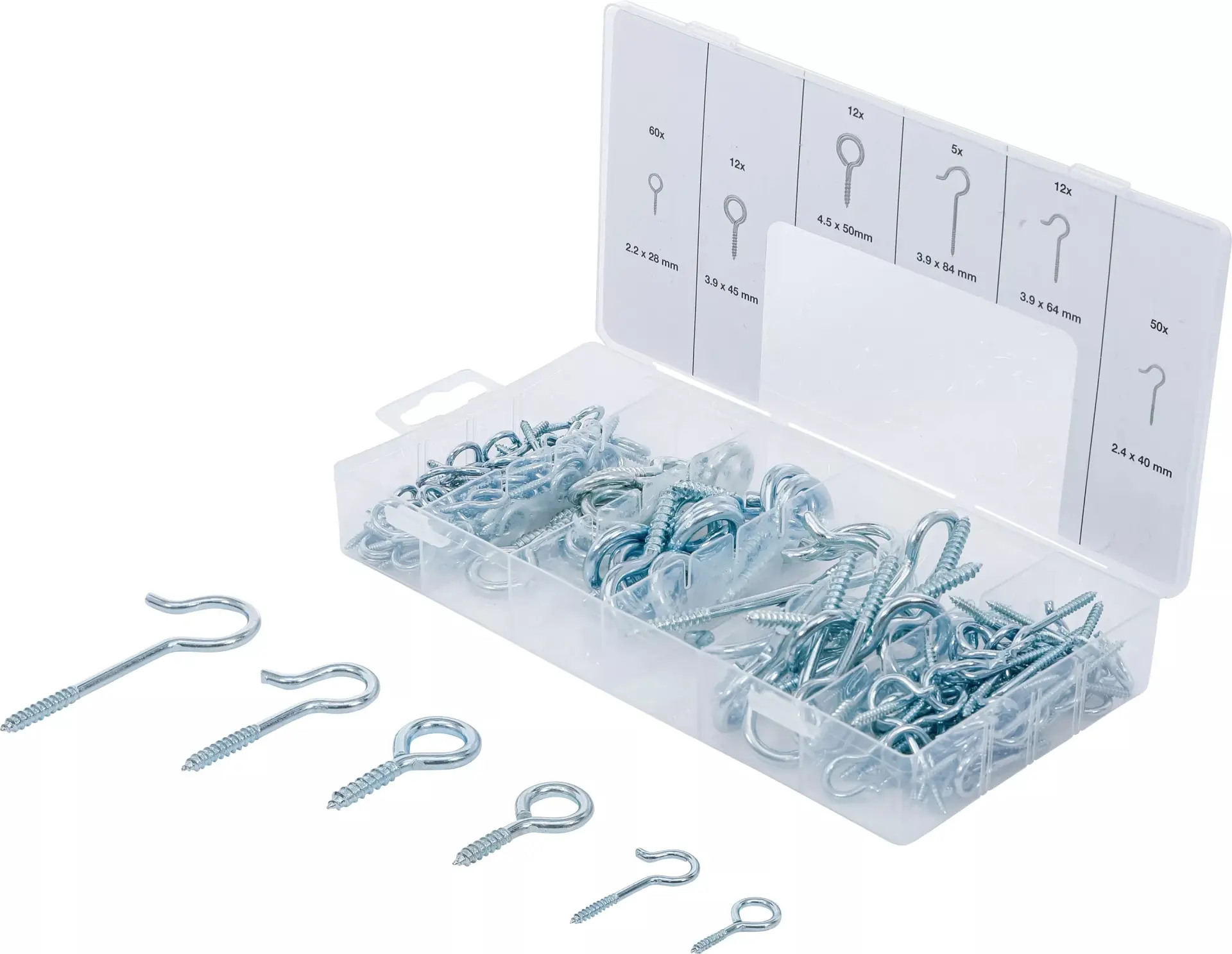 Sada 151 šroubovacích háčků a oček BGS108136 v praktické PVC kazetě nabízí různé velikosti pro všestranné využití v domácnosti i dílně. Organizace a přehlednost zajištěna díky rozdělení v kazetě.