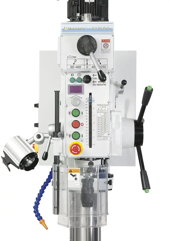 Prevodová stĺpová vŕtačka Bernardo GB 35 Vario je ťažká vŕtačka s reguláciou otáčok, automatickým posuvom a digitálnym zobrazením otáčok. Tento model sa používa predovšetkým v opravovniach a strojných dielňach.