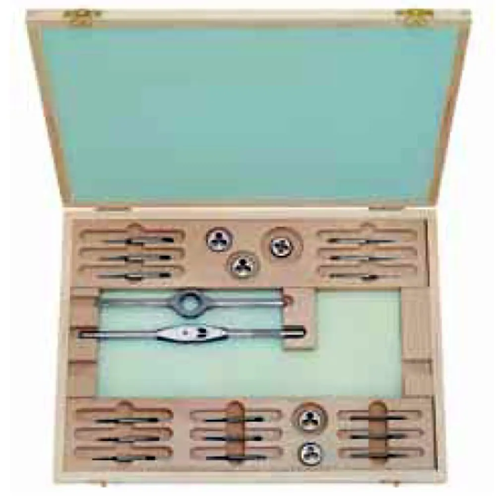 Souprava závitořezných nástrojů Bučovice Tools UNC 0, HSS (UNC 5-40 - 12-24) Sadové závitníky pravé a závitové kruhové čelisti. Provedení: Unifikovaný hrubý závit (ANSI B 1.1, BS 1580:1962) Dodáváno v dřevěné kazetě. - Sadové závitníky pravé - ne
