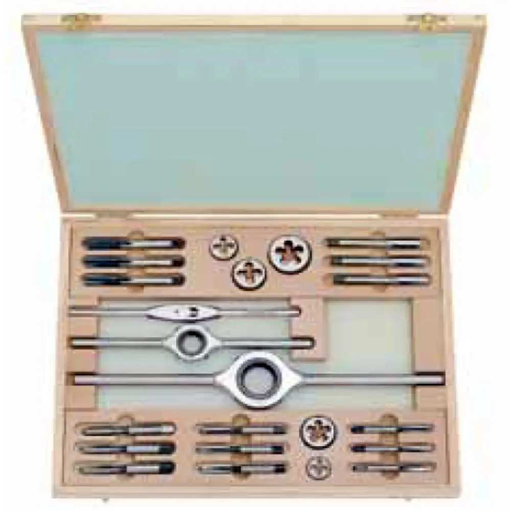 Souprava závitořezných nástrojů Bučovice Tools UNC 1, HSS (UNC 1/4-20 - 1/2-13) Sadové závitníky pravé a závitové kruhové čelisti. Provedení: Unifikovaný hrubý závit (ANSI B 1.1, BS 1580:1962) Dodáváno v dřevěné kazetě. - Sadové závitníky pravé -