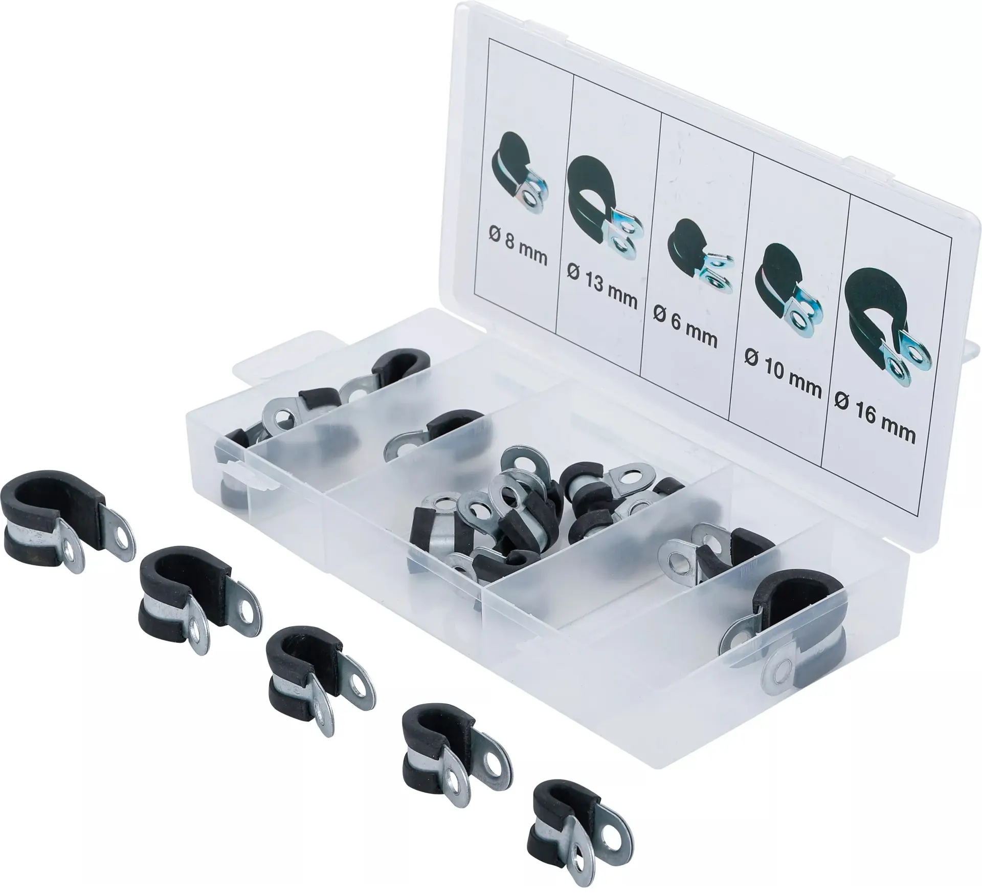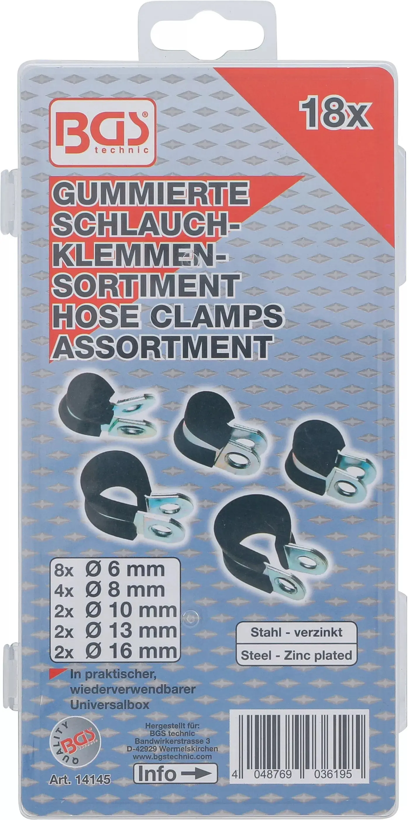 Sada hadicových příchytek BGS1014145 obsahuje 18 kusů pro průměry 6 až 16 mm, vhodných pro upevnění hadic v automobilovém i domácím prostředí. Ocelové provedení zajišťuje pevné uchycení a dlouhou životnost.