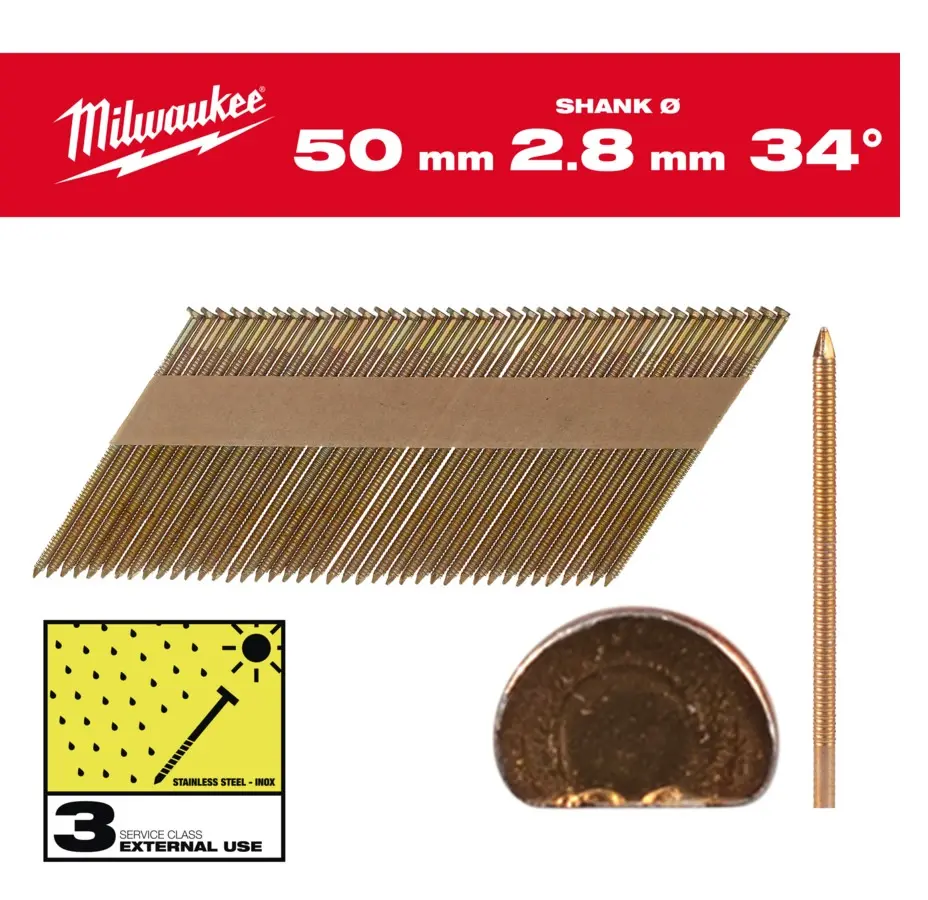 Klince Milwaukee upevnené pod uhlom 34° na papierovej páske