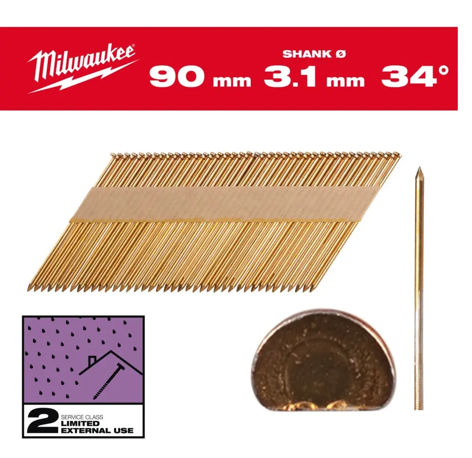 Klince Milwaukee upevnené pod uhlom 34° na papierovej páske