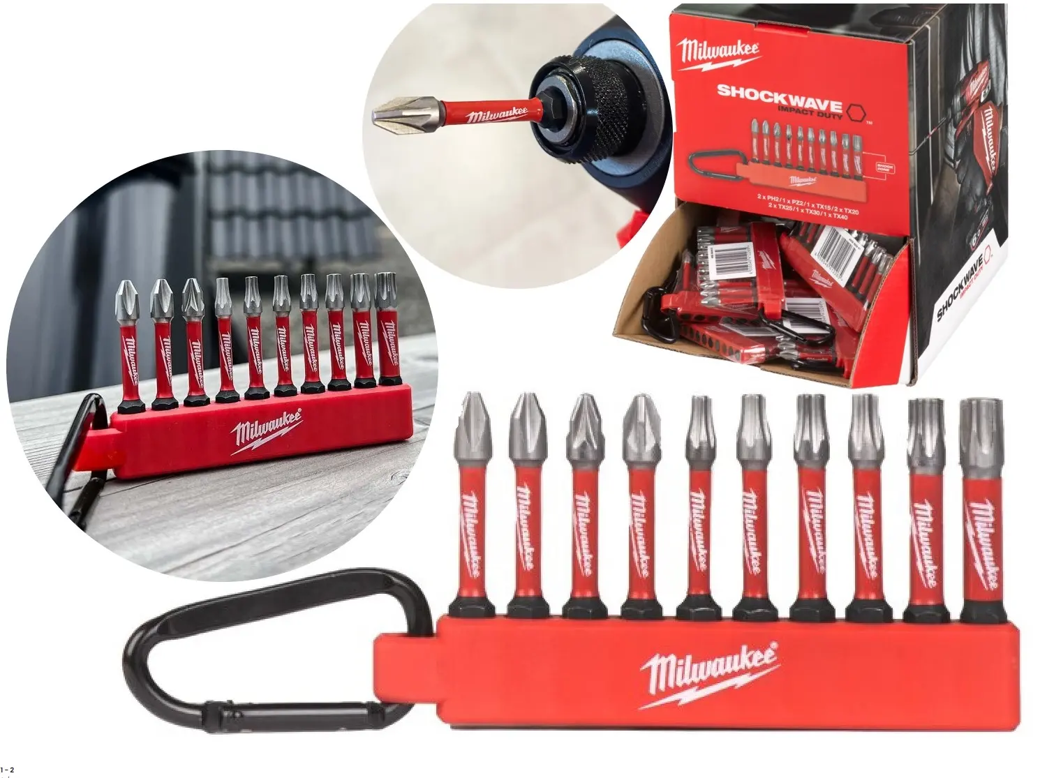 Sada bitů Milwaukee SHOCKWAVE™ IMPACT DUTY obsahuje 10 kusů bitů PH, PZ a TX, které jsou vhodné pro práci s rázovými utahováky. Praktická karabina umožňuje snadné přenášení a organizaci bitů.