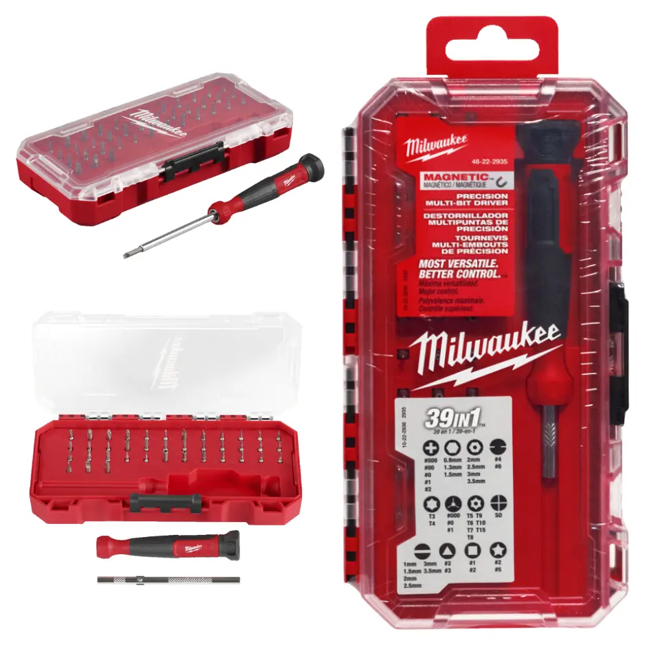 Mikrošroubovák v sadě 39v1 od výrobce Milwaukee; pohodlná rukojeť; přesný šroubovák s jednostrannými výměnnými bity: křížové, ploché, Torx, HEX, R, SPANNER atd.; kulatý vyndavcí dřík s magnetickým uchycením bitů HEX 1. Určeno pro jemnou a přesnou prá