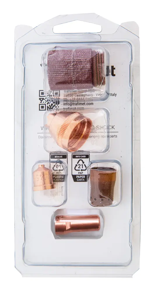 Súčasťou sú spotrebné diely, ktoré sú kompatibilné s plazmovou rezačkou Pluscut 105 A. Tieto diely zabezpečujú správne fungovanie stroja a umožňujú vám okamžite začať rezať bez potreby dokupovania ďalšieho príslušenstva. Všetky komponenty sú navrhnuté tak, aby spĺňali technické požiadavky tohto typu rezačky.