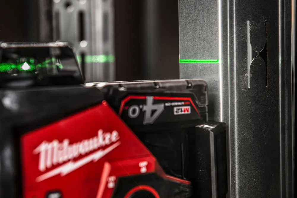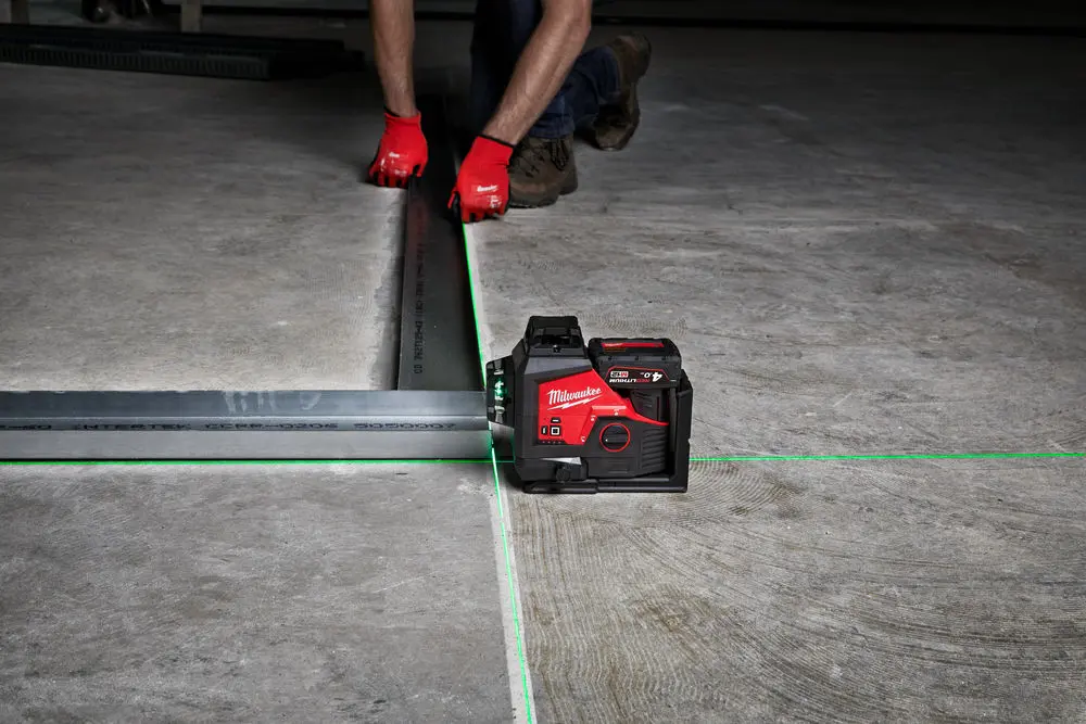 Kompaktní laser Milwaukee M12 3PLKIT-401C promítá zelený 360° paprsek, nabízí tři roviny, napájení 4,0 Ah akumulátorem a snadné ovládání pro přesné měření.