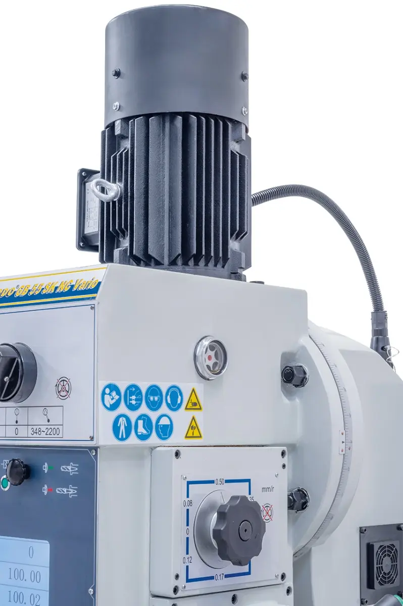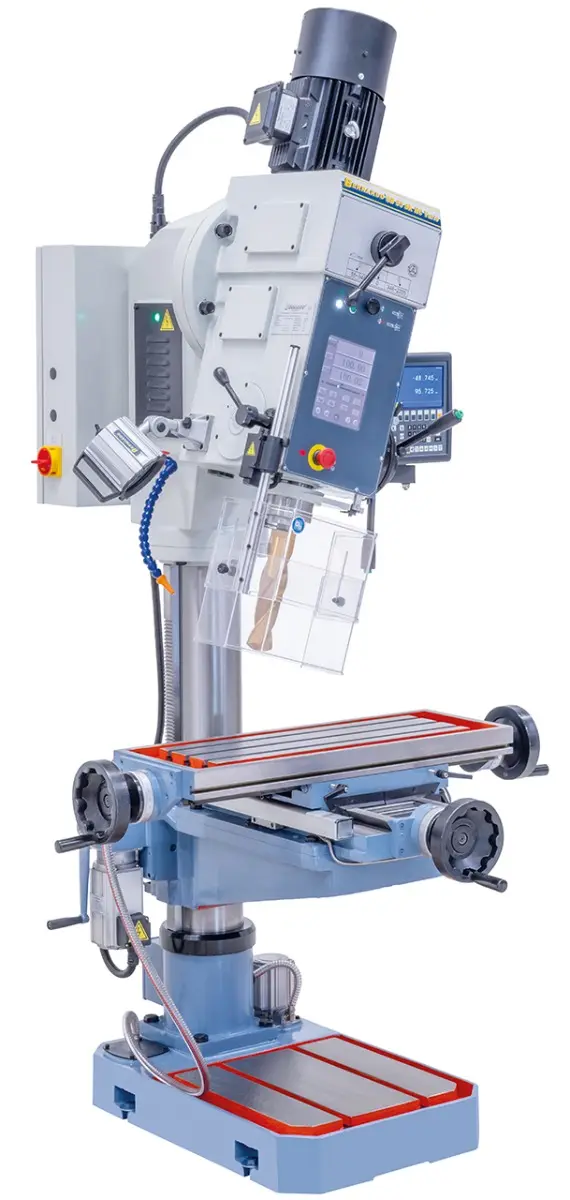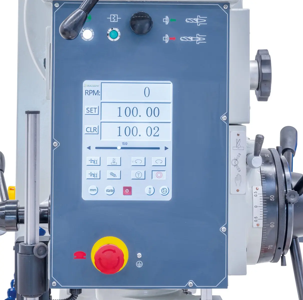 Stroj je vybavený plynulou reguláciou otáčok vretena s dvoma rýchlosťamizobrazovaných na digitálnom displeji, strojovým posuvom vretena, závitovacím zariadením a digitálnym odmeriavaním v dvoch osiach - to všetko je súčasťou štandardnej dodávky vŕtačky
