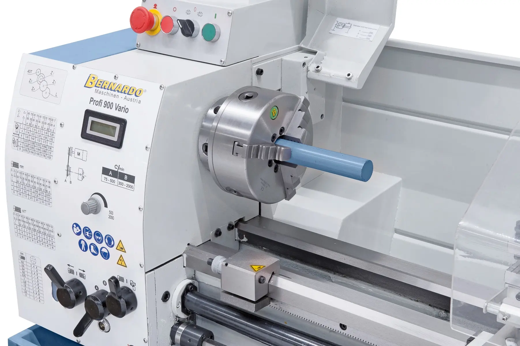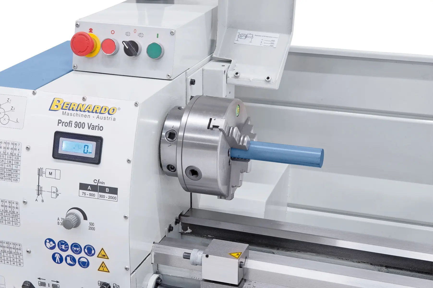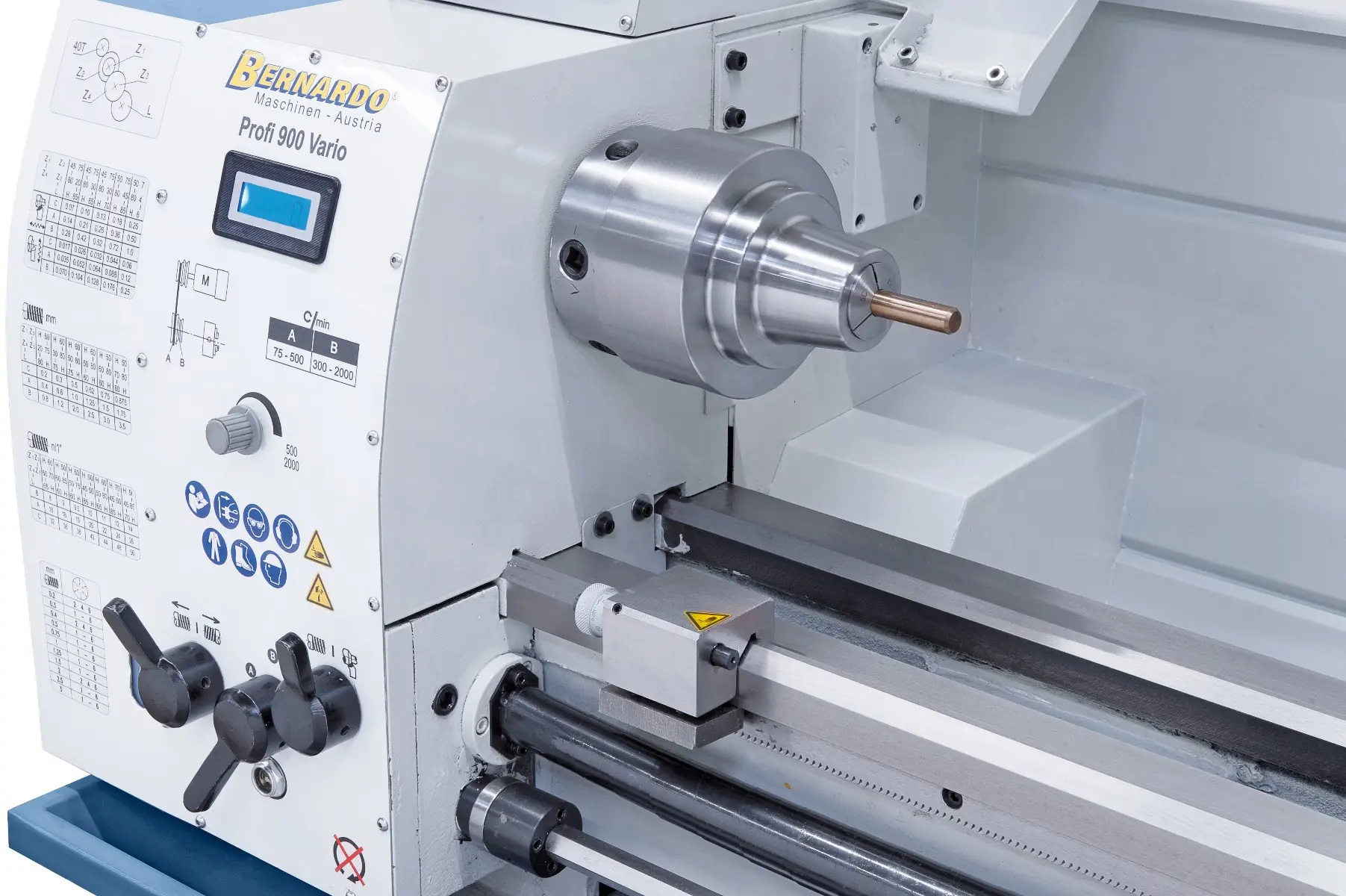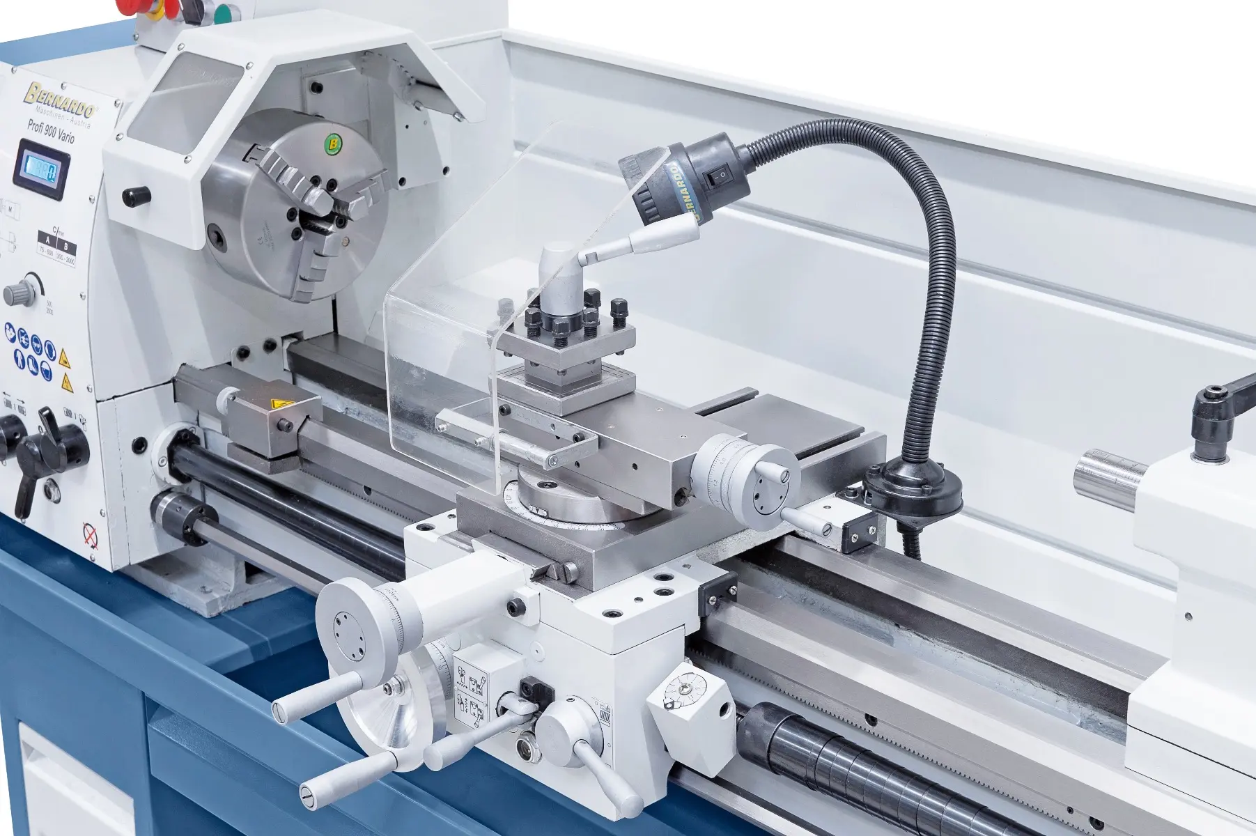 Presný sústruh s vodiacim a ťažným skrutkou Bernardo Profi Vario vybavenýmechanickou prevodovkou a frekvenčným meničom Delta v štandardnej dodávke. Ideálna stroje pre náročného užívateľa