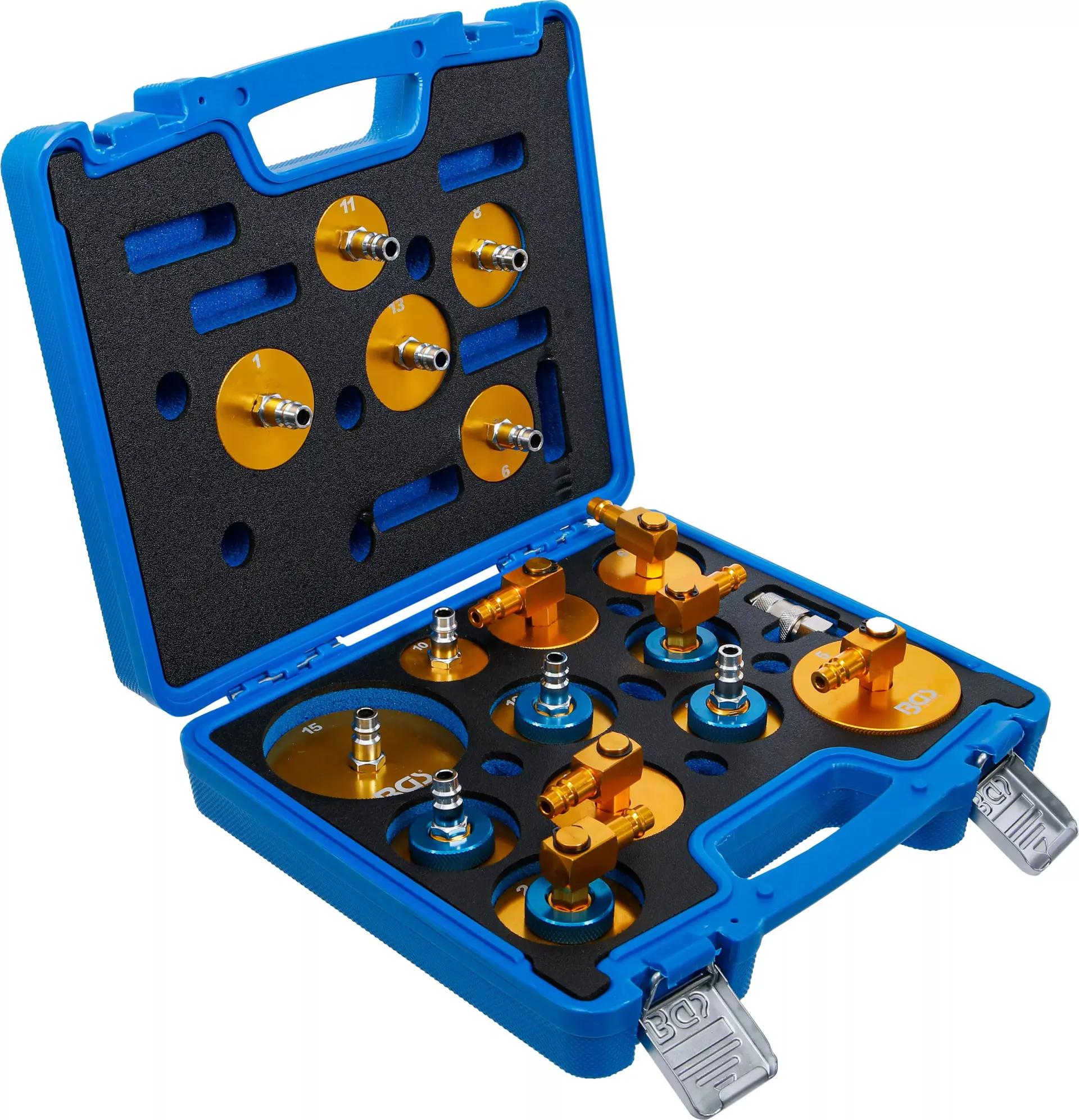 Súprava adaptérov pre odvzdušňovač bŕzd obsahuje 17 rôznych kusov, ktoré umožňujú kompatibilitu s väčšinou bežných brzdových systémov osobných aj úžitkových vozidiel. Praktické plastové puzdro uľahčuje prenášanie aj organizáciu jednotlivých adaptérov