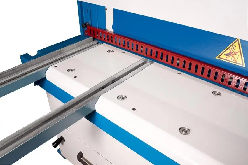 Robustní elektrické nůžky na plech se svařovanou konstrukcí a programovatelným zadním dorazem.