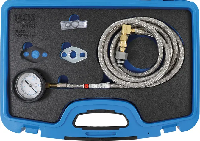 Tester protitlaku ve výfuku BGS109468 umožňuje rychlé zjištění stavu výfukového systému pomocí přesného manometru a flexibilní hadice pro snadné použití. Vhodný pro benzinové i naftové motory.