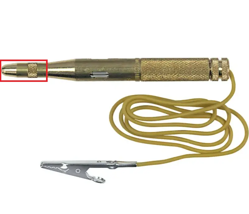 Prístroj na kontrolu svetlometov Vyhotovenie: Pre napätie 6–24 V, dvojpólový. Z mosadze, s oceľovou špičkou, pevným káblom a svorkou.