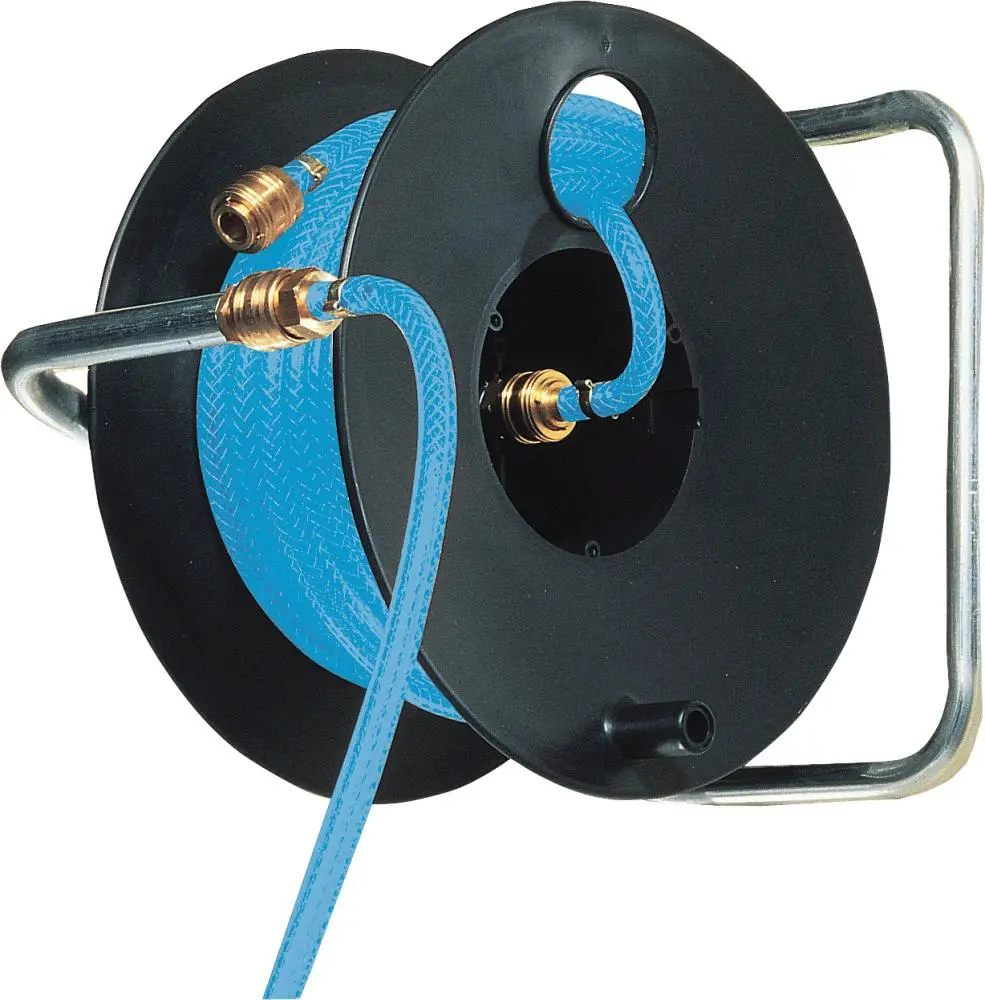 Prevedenie: Mimoriadne robustný model z vysoko pevného špeciálneho plastu s tkanou hadicou a DIN armatúrou. Podstavec z pozinkovanej oceľovej rúrky. Vďaka axiálnemu pripojenie možno bubon navíjať a odvíjať aj počas prevádzky. Dodáva sa s kovovými jednoručnými rýchlospojkami, spojovacie hadicou a nástenným držiakom.