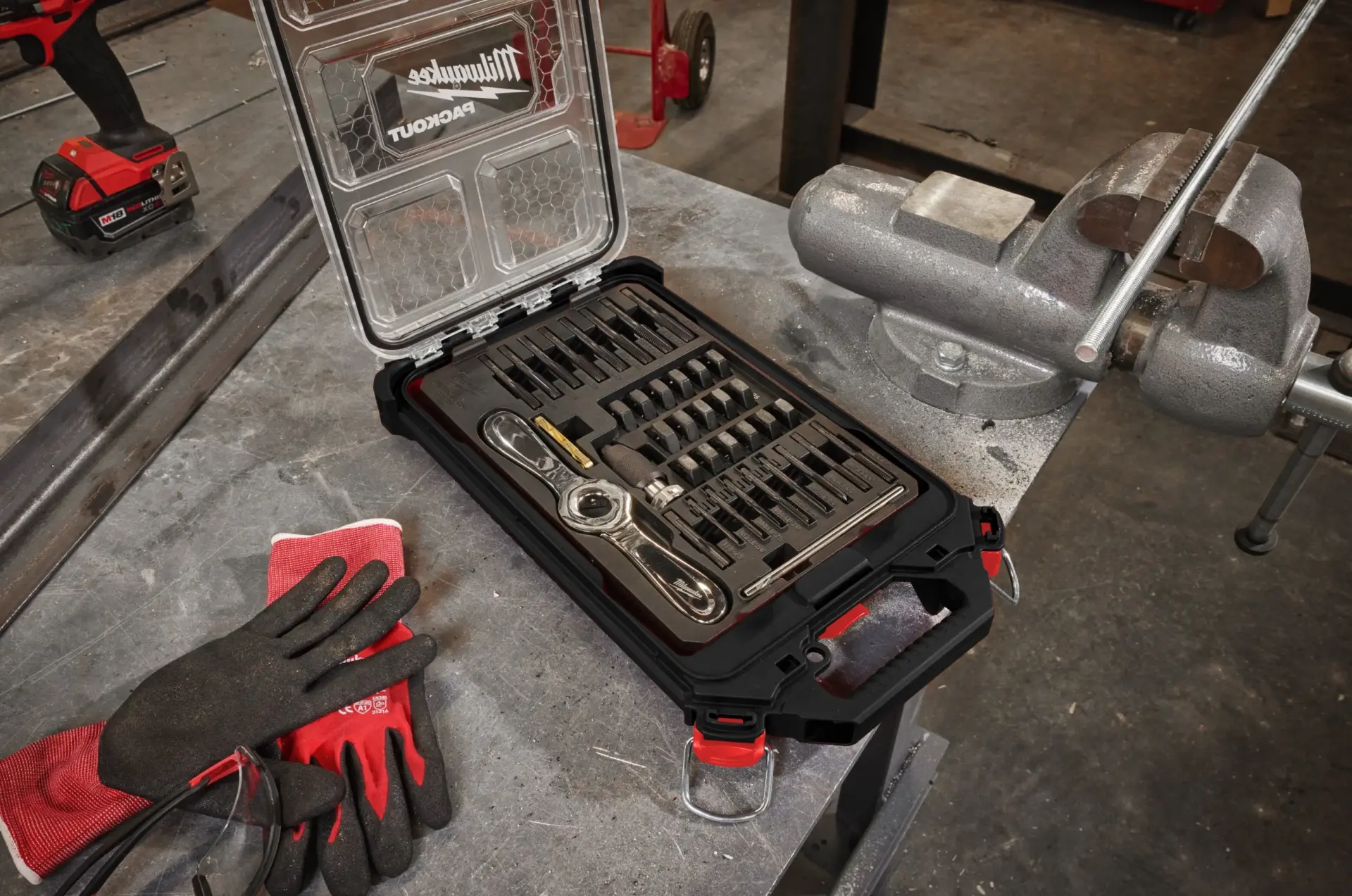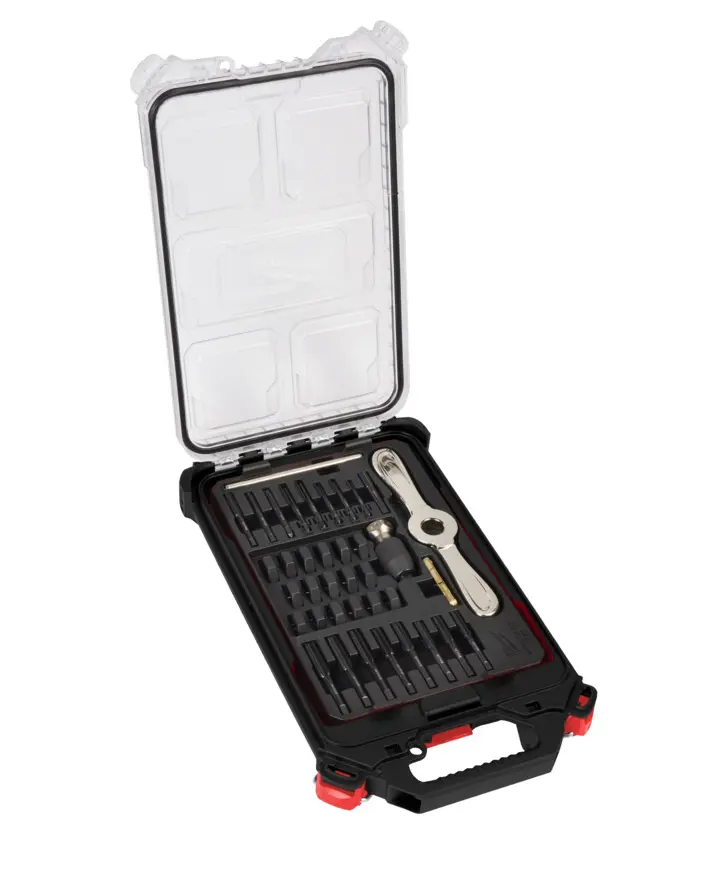 Sada 38 dílů obsahuje závitníky a očka M3–M12 s rukojetí Hex-LOK™ 2 v 1, která umožňuje rychlou výměnu a přesné vedení. Robustní kufr PACKOUT™ zajišťuje přehledné uložení a snadný transport.