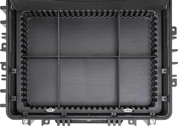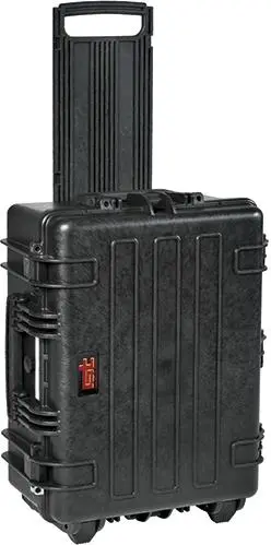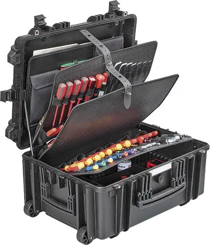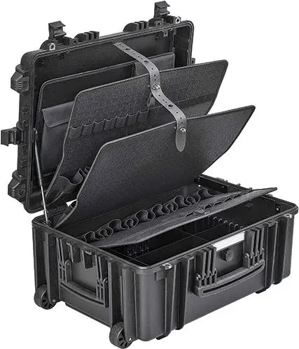 Z rázuvzdorného plastu HDPE, čierny, s pevnými nástrojovými tabuľami, ako aj so stabilnou rukoväťou na nosenie, so zaskakujúcou, ergonomickou teleskopickou rukoväťou a veľkými, ľahko idúcimi transportnými kolieskami
