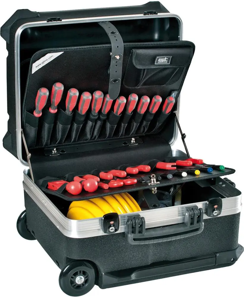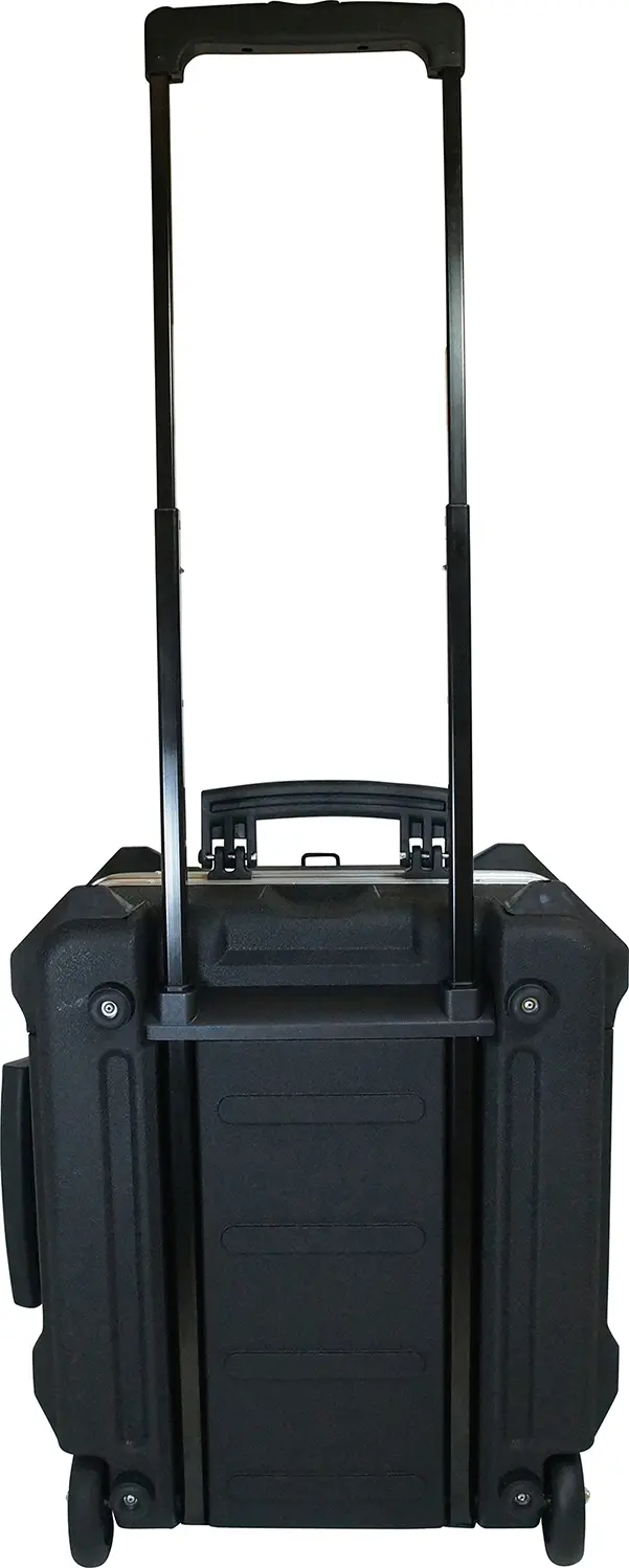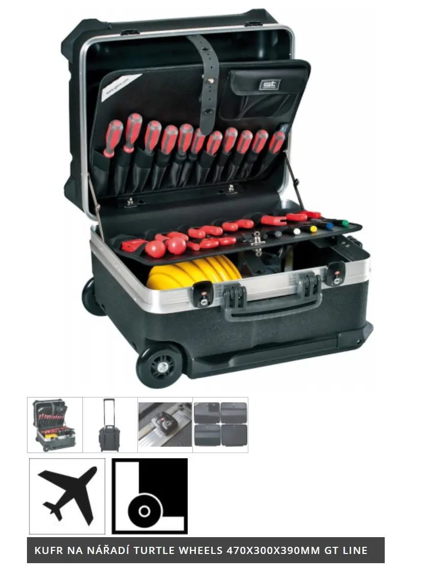 Prevedenie: Z nárazuvzdorného plastu HDPE, čierny, s odolnými vyberateľnými nástrojovými tabuľami, ako aj so stabilnou rukoväťou na nosenie, sa zaskakujícící, ergonomickou teleskopickou rukoväťou a veľkými, ľahko idúcimi transportnými kolieskami. Škrupina dna s výškou 160 mm, voľne deliteľné. Kufor zaťažiteľný až do 25 kg, dvojitý rám z hliníka. Veľmi stabilná, ochranné integrované gumové nohy. Zamykateľný skrze dva klopné cylindrické zámky TSA. Model vhodný pre prepravu lietadlom. Dodáva sa bez obsahu.