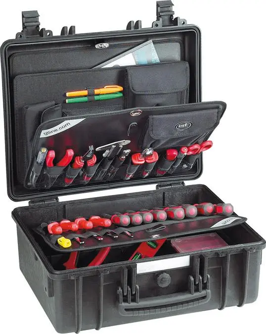 Prevedenie: Z odolného polypropylénu, čierny, nerozbitný a nárazuvzdorný, prachotesný a vodotesný a tepelne odolný od -33° C do +90°. Vzduchotesne uzatvára, s ventilom na vyrovnávanie tlaku. S pevnými doskami na náradie, ako aj so stabilnou rukoväťou na nosenie. Výška škrupiny dna 143 mm. Kufor zaťažiteľný až do 25 kg. Veľmi pevne stojace a odolný. Zamykateľný skrze dva klopné cylindrické zámky. Model vhodný pre prepravu lietadlom. Dodáva sa bez obsahu.