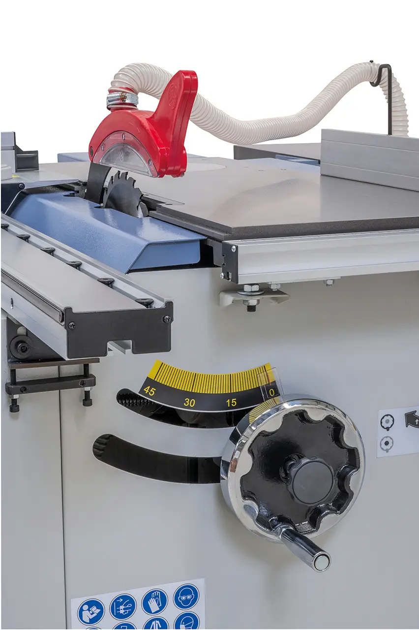 Štandardne s naklápacím vodiacim pravítkom a vývodom na odsávanie pilín a triesok - pripojenie s priemerom 100 mm