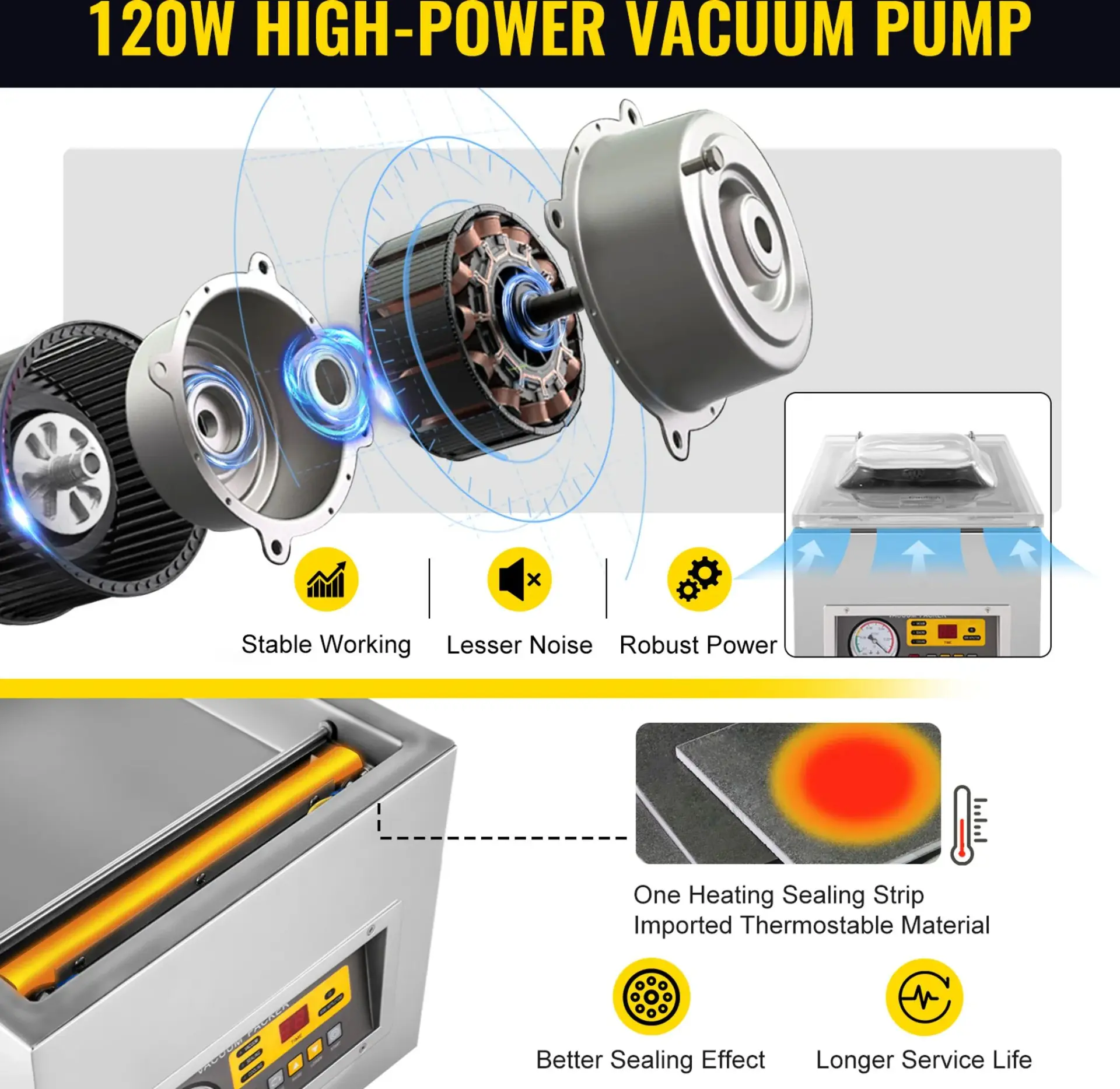 Stroj využívá 120 W vakuovou pumpu a vysoce kvalitní elektrické komponenty