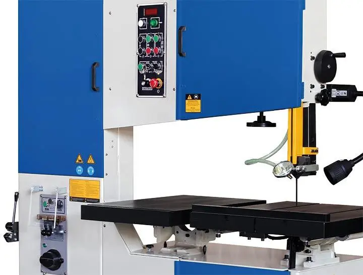 Vertikální pásová pila na kov s robustní konstrukcí, svařovací jednotkou pásu, velkým vyložením a elektrickým posuvem stolu.