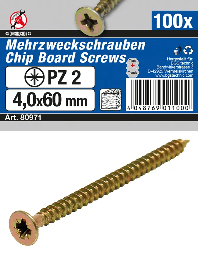 Víceúčelové šrouby s křížovou drážkou PZ2 o rozměrech 4,0 x 60 mm jsou určeny pro široké spektrum montážních prací v domácnosti i na stavbě. Díky univerzálnímu provedení je lze použít při spojování dřeva, dřevotřísky, plastů i některých kovových materiálů. Balení obsahuje 100 kusů, což umožňuje realizovat větší projekty bez nutnosti častého dokupování.