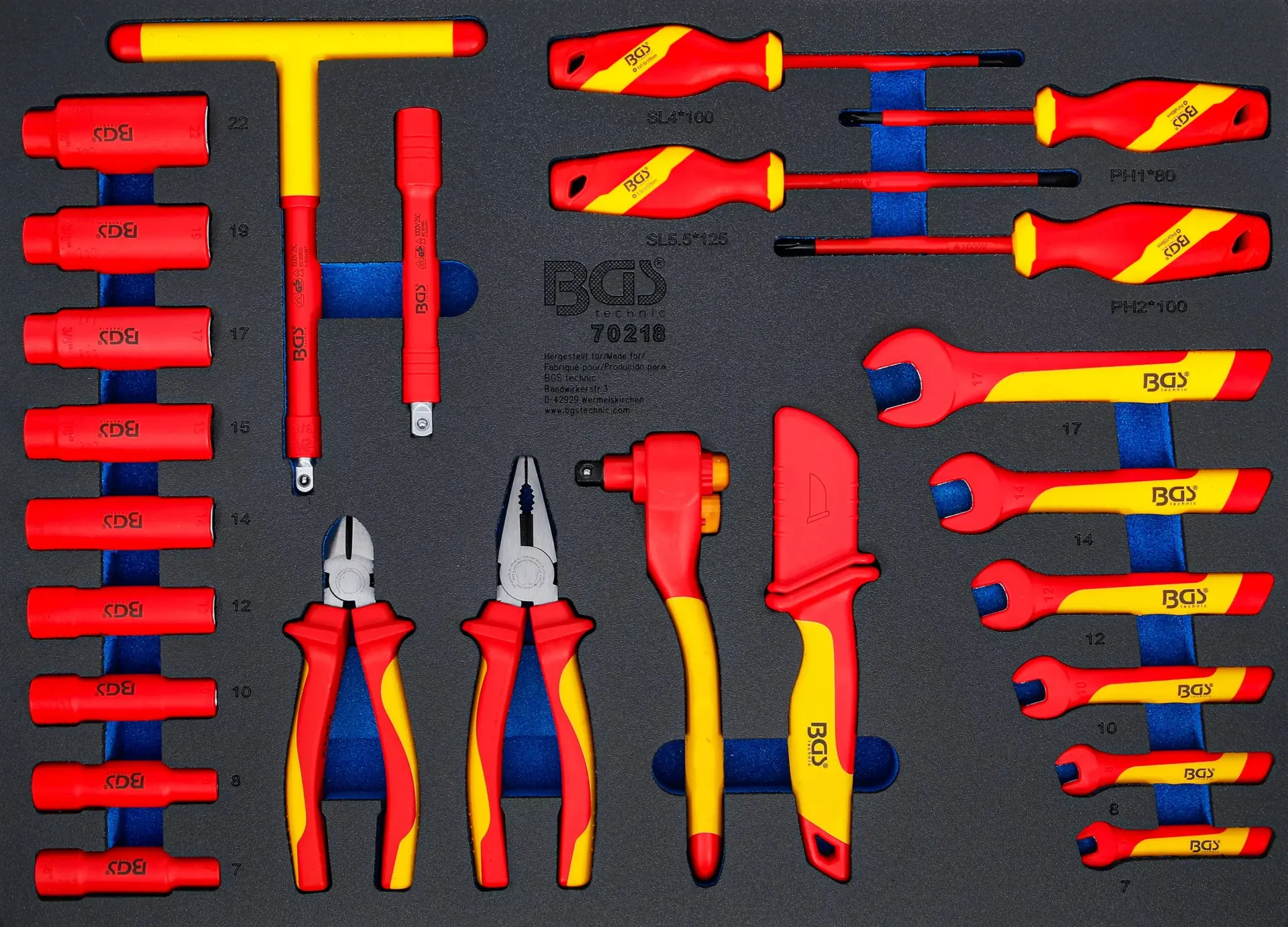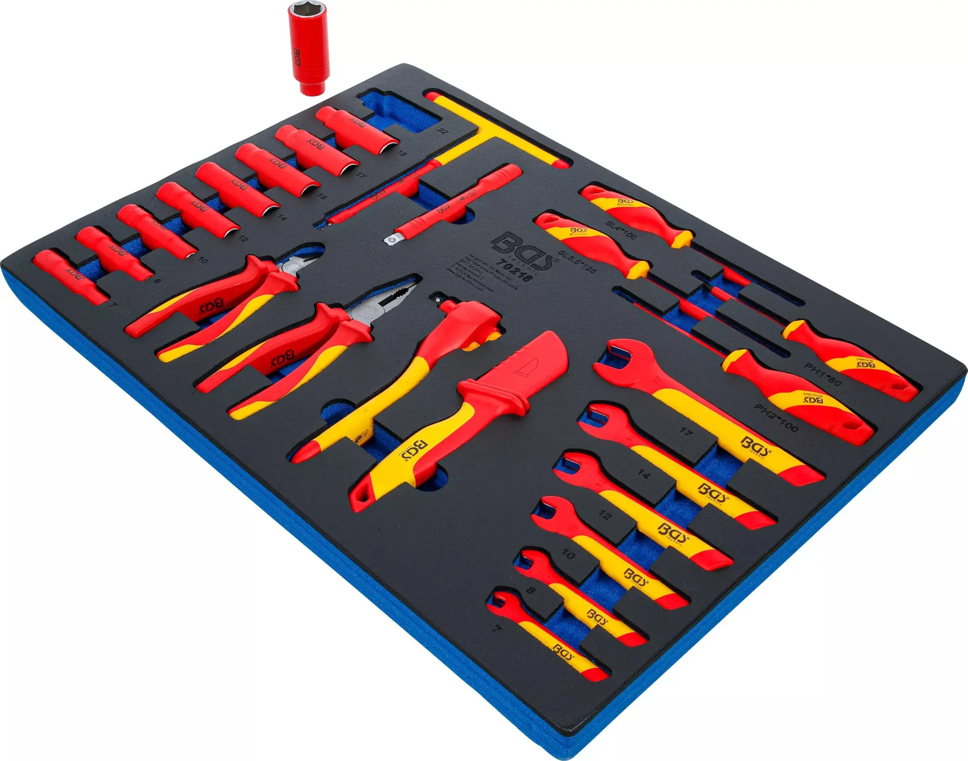 Vybavená vložka do dielenského vozíka na náradie: račňa 3/8", T-rukoväť + zástrčné hlavice 7 ÷ 22 mm (26 dielov - VDE)