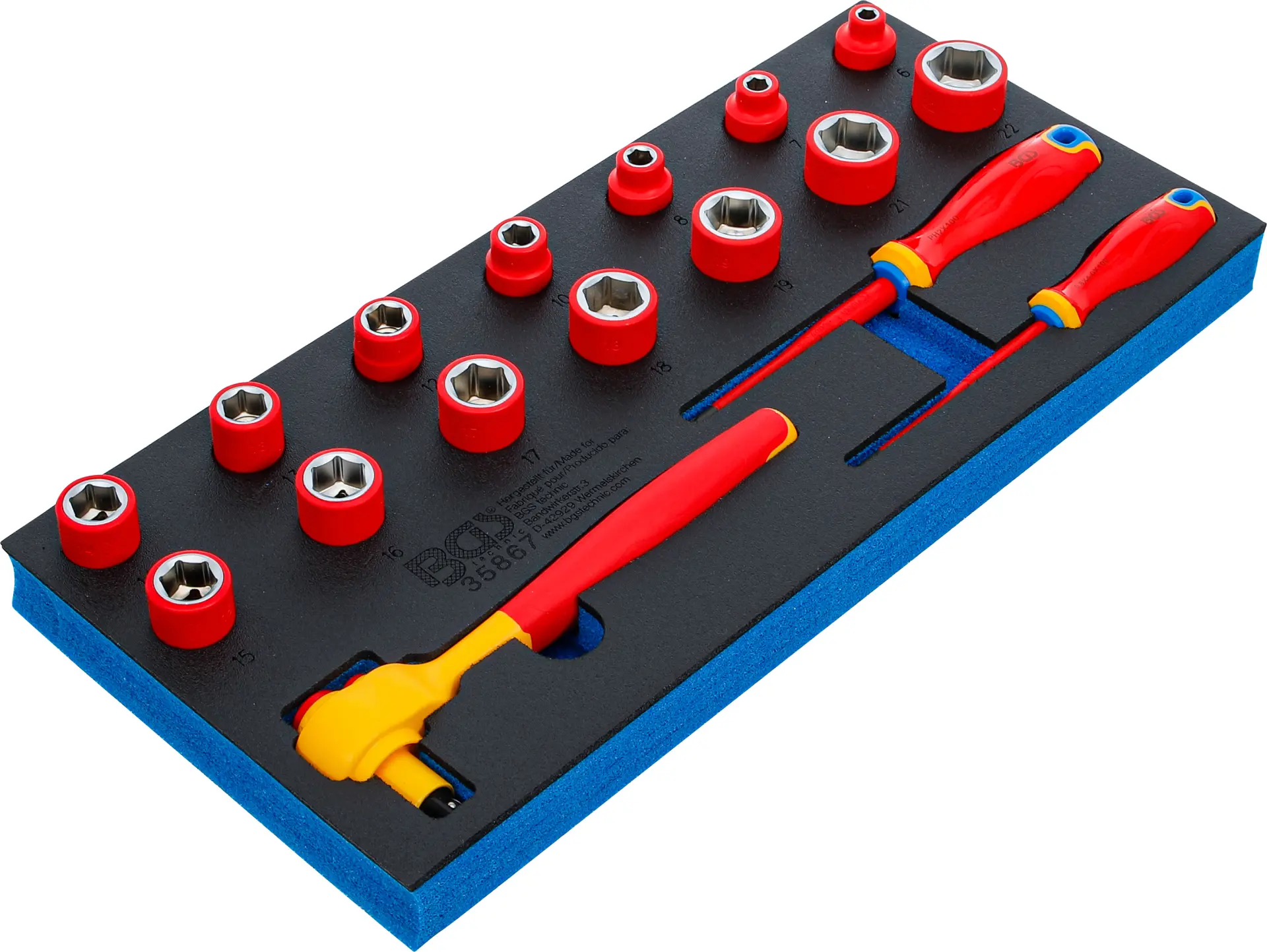 Táto nástrojová priehradka 1/3 je navrhnutá pre efektívnu organizáciu a rýchly prístup k náradiu. Obsahuje 17 starostlivo vybraných kusov, ktoré zahŕňajú VDE kľúč a skrutkovač s 10mm (3/8") hnacím hriadeľom. Všetky komponenty sú uložené v prehľadnej priehradke, ktorá šetrí miesto a uľahčuje orientáciu v náradí.