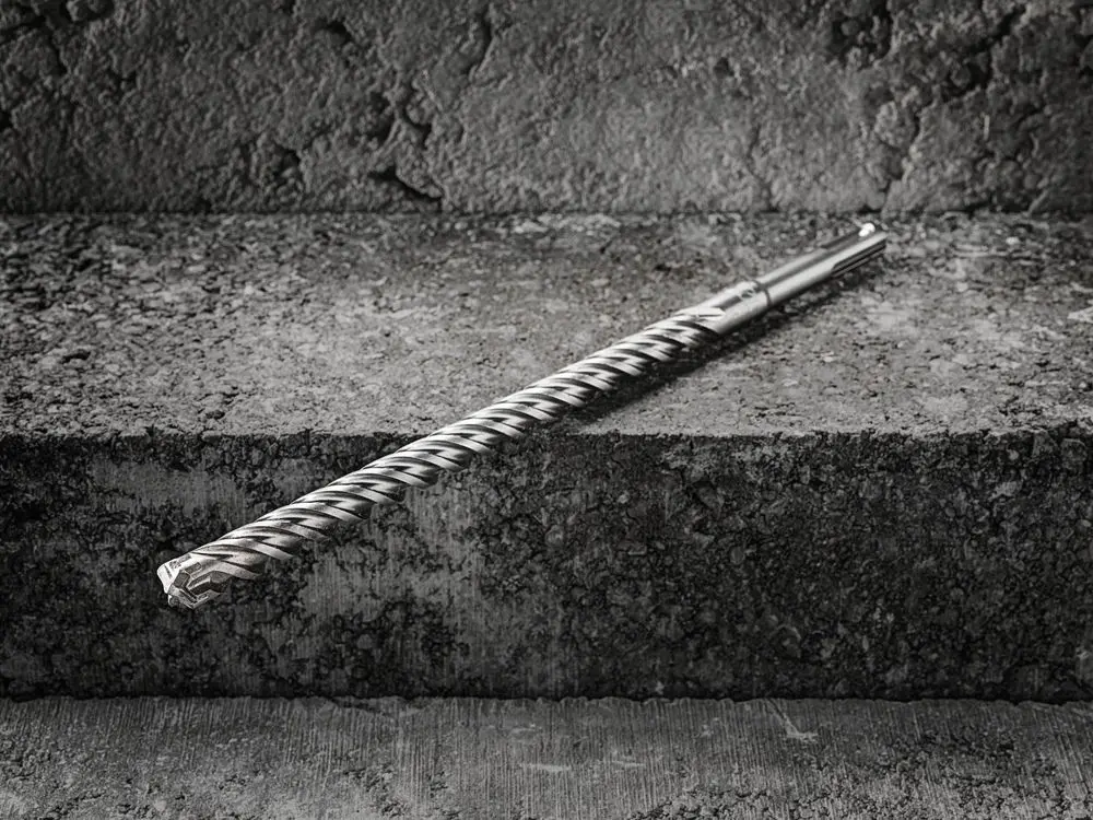 Štyri symetrické 90° rezné hrany zaručujú dokonale okrúhle diery na upevňovanie hmoždiniek a redukciu zasekávania vrtáka pri kontakte s armovacou tyčou
