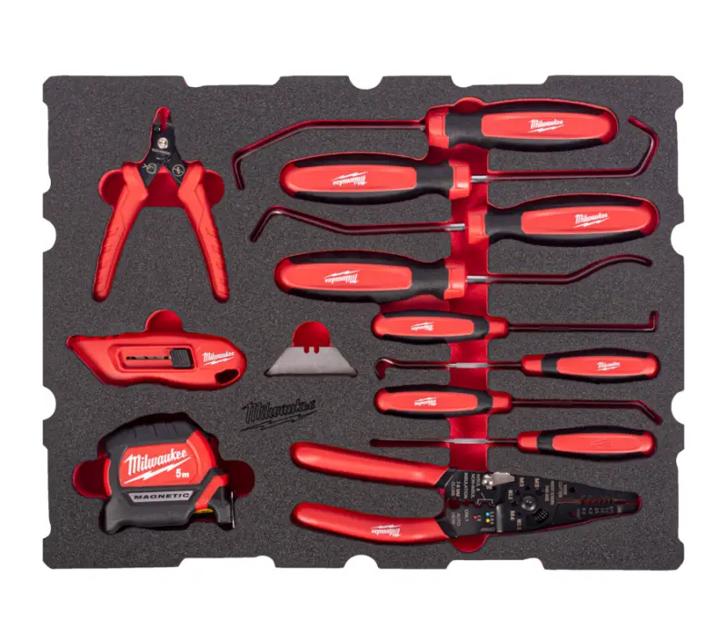 Vybavená penová vložka Milwaukee do PACKOUT boxu, háky a vyťahováky + meter + nôž, kliešte, 17 ks náradie, 4932501877