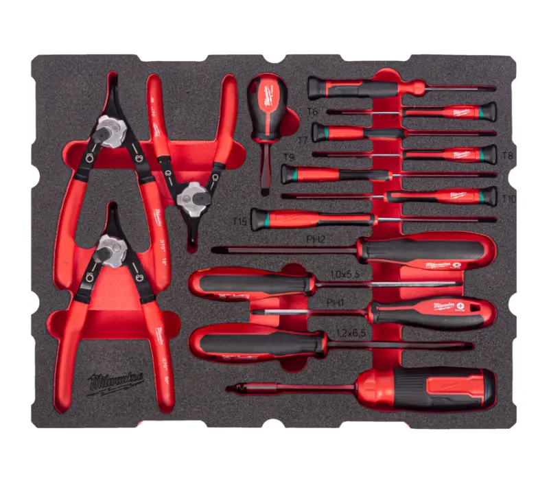 Vybavená penová vložka Milwaukee do PACKOUT boxu, skrutkovače a kliešte na poistné krúžky, 44 ks náradia, 4932501876
