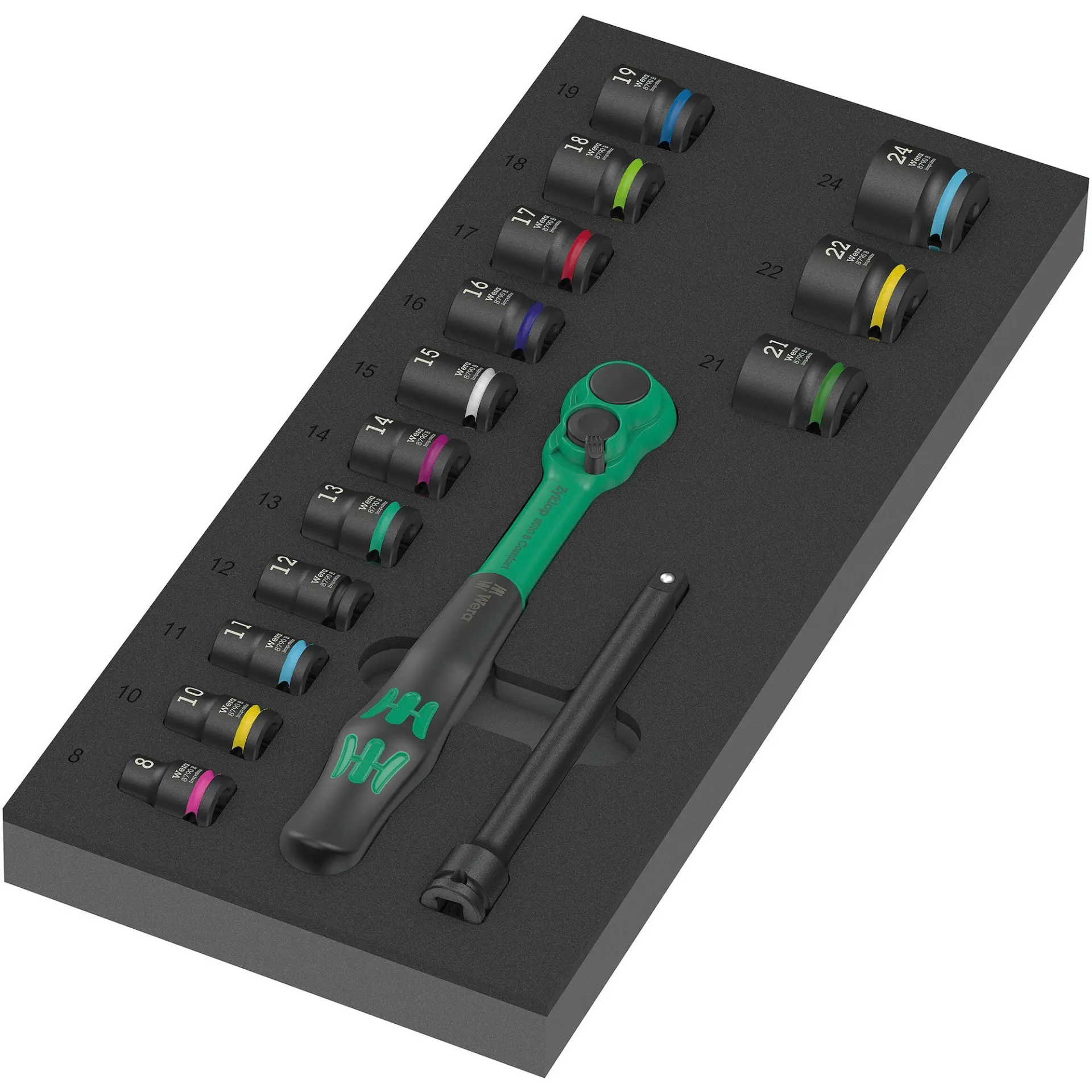 Penová vložka Wera, pre dielenský vozík. Prepínacia račňa 3/8" Zyklop Comfort 8010 B s hlavicami Impaktor