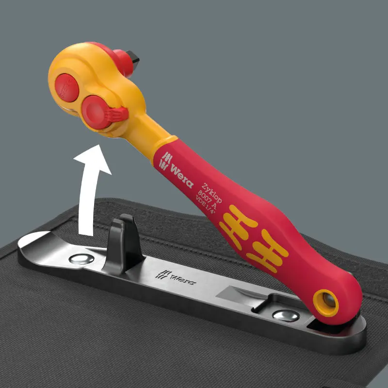 Račňová sada, 22dielna, v textilnom boxe. Voľne otočná hlava račne s 5 definovanými fixáciami, zástrčné a nástrčné nástavce. Všetko s izoláciou VDE Jednotlivo testované nástroje podľa IEC 60900