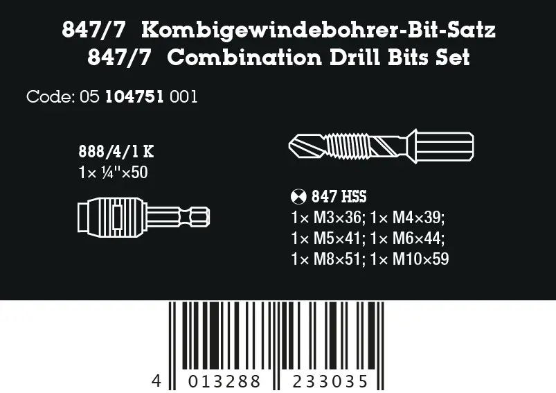 Wera 104751 Kombinované bity 1/4" s HSS závitníkmi M3 ÷ M10 typ 847/7 - 7 dielov (W05104751001)