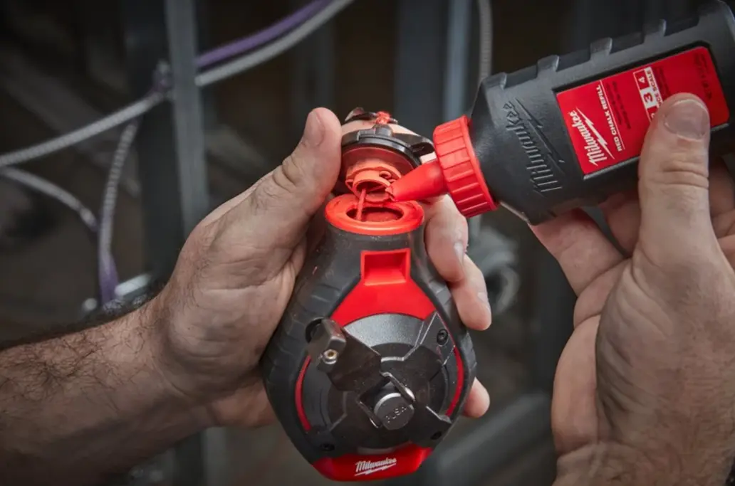 Značkovací šňůra Milwaukee s modrou náhradní náplní umožňuje rychlé a přesné vyznačení čar na různých površích, šňůra je odolná proti přetržení.