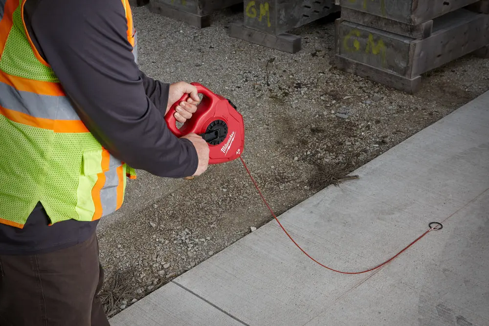 Svinovací značkovací sňůra Milwaukee s délkou 30 metrů je vybavena odolným pouzdrem a rychlým navíjecím mechanismem pro efektivní značení na stavbě.